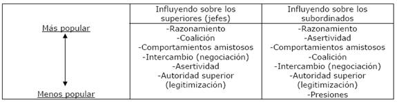 Robbins presenta un análisis interesante sobre la popularidad de estas tácticas de influencia, cuando se utilizan con los jefes (niveles superiores) o con subordinados que resume en la tabla siguiente.
